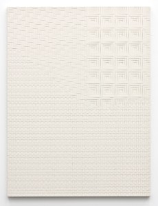 Tauba Auerbach at Paula Cooper (ended June 9) features her Fold paintings which have been widely exhibited at this point at art fairs and biennials, but also new Weave paintings. The woven surface of the canvas reminds me of lanyards at camp and the marvelous Sheila Hicks fiber works at Sikkema Jenkins. All the work was hung maybe 8-10 inches off the floor, in the same way Dan Walsh installs his work in the same gallery. I asked one of the dealers if they (Tauba and Dan) had discussed this or even met, and they were hard-pressed to find a connection. Whatever the reason, it worked and the woven pieces seemed to be made of white light. You dance with them trying to nail down the color and find the patterns extensions and terminations.