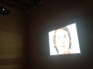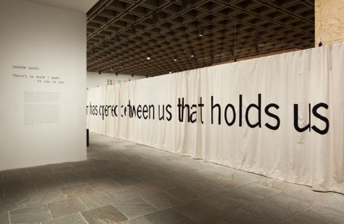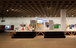 Sharon Hayes at the Whitney is not so much a show as it is another intervention. It feels like a temporary stage for performance to live. The show contains plywood risers, rooms and hallways, a room concealing curtain with text and a few pedestals (just boxes for stuff to be on) designed in collaboration with the artist Andrea Geyer. Paint those steps gray instead of black and its Breuers building flipped over! The video projections range from DIY to incredibly polished. Yard (Sign) is here again, newly expanded and raised up a few steps, segregating the viewer and moving the signs into direct sight lines. I liked the presentation better at floor height when the signs were in their natural habitat.