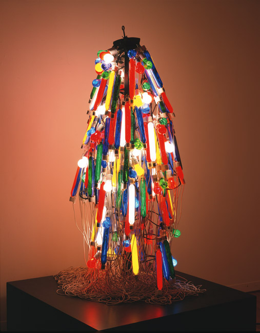 Atsuko Tanaka crystallized as the most important of the group in my thinking about this show. From her works on paper (some pretty, some challenging), her conceptual sound piece “The Bell” and the piece she is best know for The Electric Dress, she exhibited constant innovation and made beautiful objects. I like Kusama very much and since she has nudged the door open for Japanese Avant Garde artists, can some American Institution please review Atsuko Tanaka’s varied contributions to contemporary art. Others certainly engaged me and led me to want to read and hear more. There was an alluring film by Shimamoto Shōzō made of found newsreel, degraded with vinegar and painted on. His action paintings (hurling paint filled bottles at canvas) were less interesting. Yoshihara Jirō, the groups guiding force made beautiful, unrevolutionary but aesthetically pleasing, canvases.