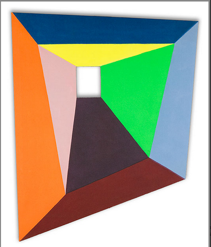 The first time I saw Paul Reed and The Shaped Canvas in the 60’s at D. Wigmore it was on the floor. All of the work had yet to be hung because I peeked in before it was open. I do not like to bother galleries during install, but I was compelled by what I saw: canvases that were glowing and seemed ready to lift off into the sky with Lucy and her diamonds. They were restrained in a way, at least as restrained as a day-glo rocketship can be. I was in awe. These shapes, not all bizarre and outlandish, were full of color, opacity, clean line and geometric brilliance. I saw canvases recognizable as Kenneth Noland and others that seemed familiar as Stella but were actually Thomas Downing. Gene Davis even makes a brief appearance. The shaped canvas might seem like old hat to those of us who have spent our childhoods at MoMA, but Reed was doing something in the 60’s that remains fresh today. They are jewel like, prismatic and filled with brightness. They relate to Light and Space art as much as they do colorfield painting.