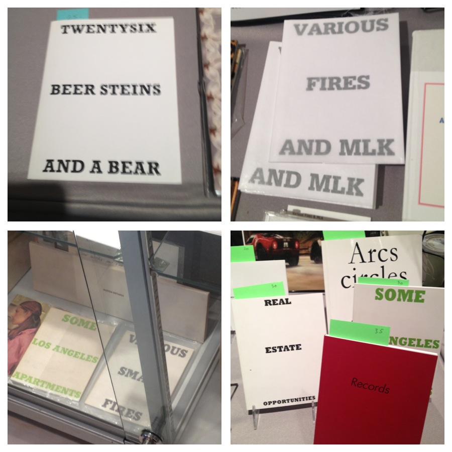 I wish I could have bought more artist books. What I didn’t buy: Dan Walsh had several beautiful recent artists books I would have loved to own. There were enough Ed Ruscha books to start various small fires (couldn’t help myself). I would have liked the $1,800 76-book ABCED box set at ABC (Ruscha homage central), but I will have to settle with my book about the books. There were several Allen Ruppersberg books I would have liked, but I think the thing I was most intrigued by was the pop up shop Paper Cuts by David Kennedy Cutler and Sara Greenberger Rafferty. With work by Cutler, Rafferty, Kate Shepherd, Rachel Foullon and Ruby Sky Stiler I felt like I was in a real artist run pop up shop.