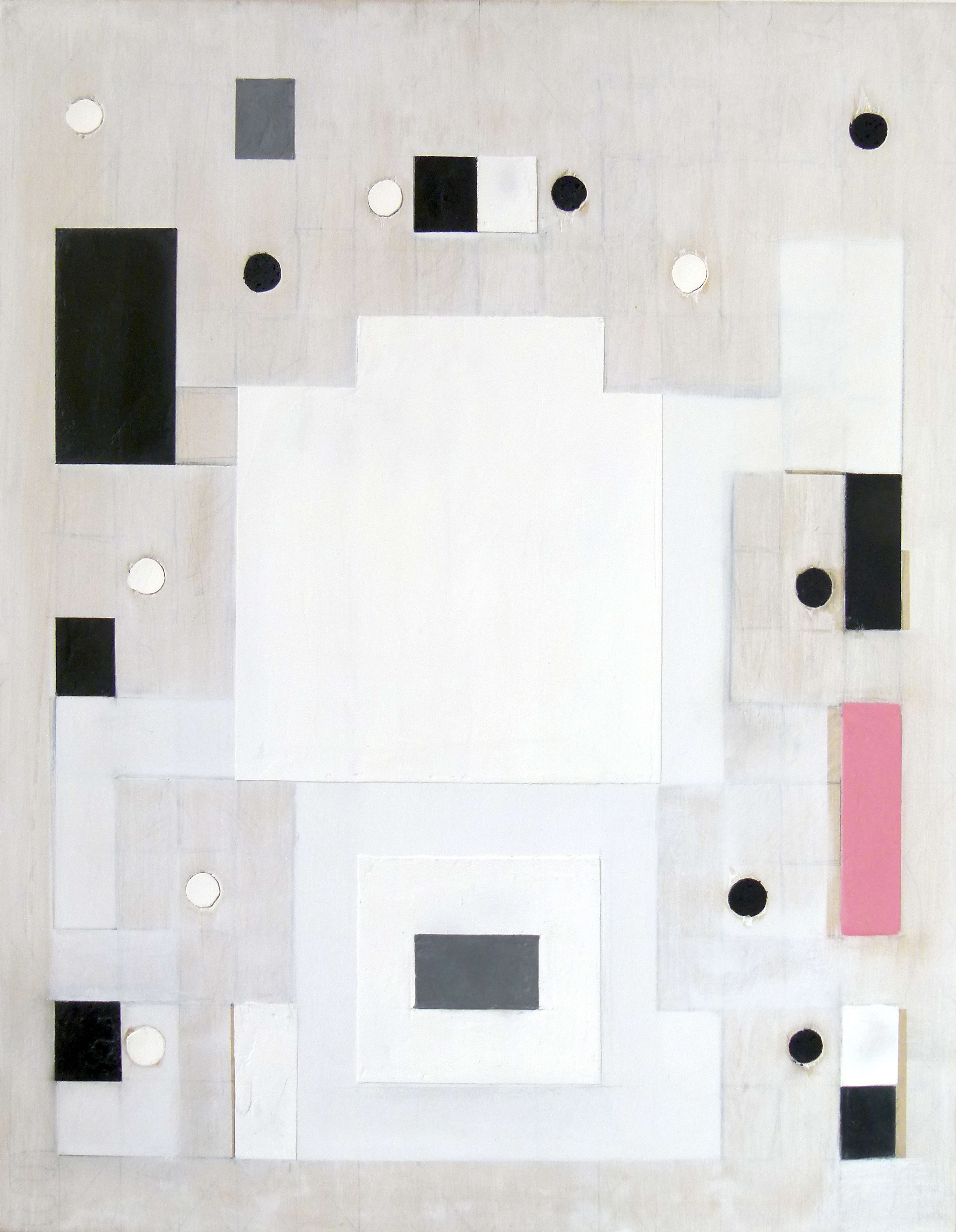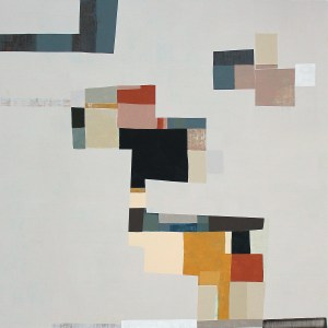 Karen Dow makes flat work, yet the architectural and sculptural elements within belie their flatness. The distinct layers in the artist’s newest body of work act in surprising ways, exposing forms while ghost images reveal themselves under marble dust gray. Like exposed composite rock segments, striations appear. Stacked and patchworked forms assert themselves as the gray fogs over layered and masked formations. Most of these solid forms are the final layer, completing the balancing act. Within Dow’s painting, there is always the possibility of imbalance and irregular shapes ready to topple at the slightest breeze.