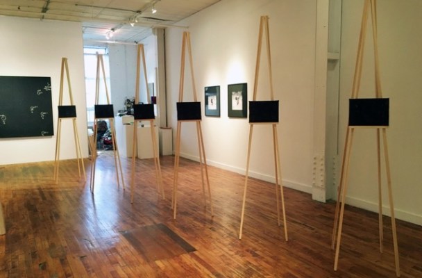 JB: I would love to know more about the white on black drawings that inspired them. Stephanie mentioned they were notes on a photo but that you liked the notes more than the photo, or maybe that you found the notes more interesting. And then the weaving process…and the easels. I want to know something about everything.